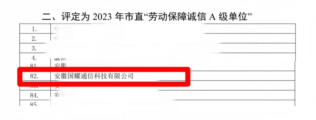 近日,六安市人力資源和社會(huì)保障局公布了用人單位勞動(dòng)保障誠(chéng)信守法等級(jí)評(píng)定結(jié)果,授予安徽國(guó)耀通信科技有限公司2023 年市直“勞動(dòng)保障誠(chéng)信 A 級(jí)單位”榮譽(yù)稱(chēng)號(hào)。