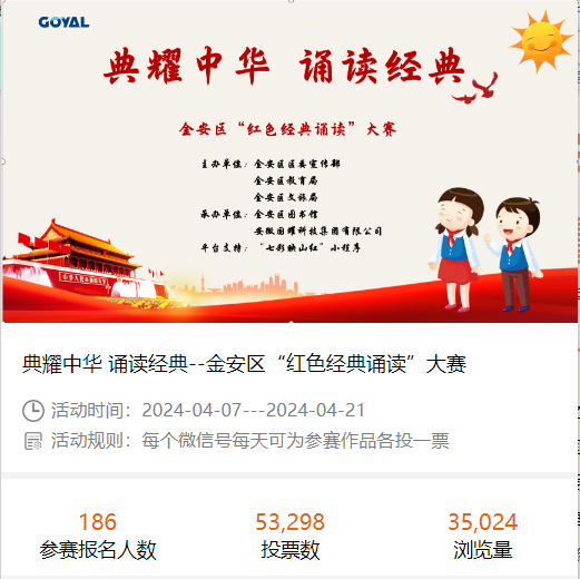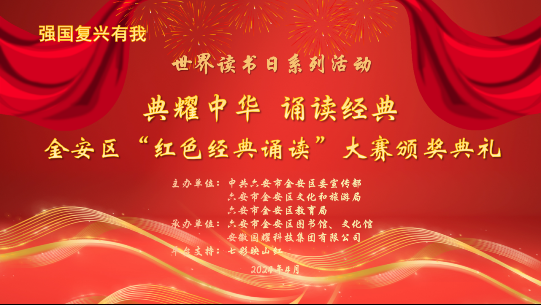 在中華人民共和國成立75周年之際,為深入學(xué)習(xí)貫徹黨的二十大精神,營造濃厚的愛國主義教育氛圍,厚植青少年家國情懷,中共金安區(qū)區(qū)委宣傳部、金安區(qū)文旅局、金安區(qū)教育局、金安區(qū)圖書館、文化館及安徽國耀科技集團(tuán)有限公司聯(lián)合舉辦了“典耀中華·誦讀經(jīng)典——金安區(qū)‘紅色經(jīng)典誦讀’大賽”。