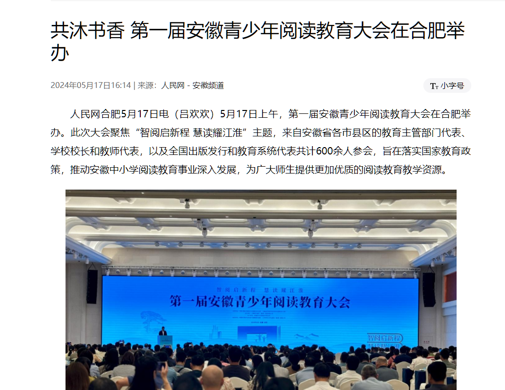 5月17日上午,第一屆安徽青少年閱讀教育大會(huì)在合肥舉辦。此次大會(huì)聚焦“智閱啟新程 慧讀耀江淮”主題,來(lái)自安徽省各市縣區(qū)的教育主管部門代表、學(xué)校校長(zhǎng)和教師代表,以及全國(guó)出版發(fā)行和教育系統(tǒng)代表共計(jì)600余人參會(huì),旨在落實(shí)國(guó)家教育政策,推動(dòng)安徽中小學(xué)閱讀教育事業(yè)深入發(fā)展,為廣大師生提供更加優(yōu)質(zhì)的閱讀教育教學(xué)資源。