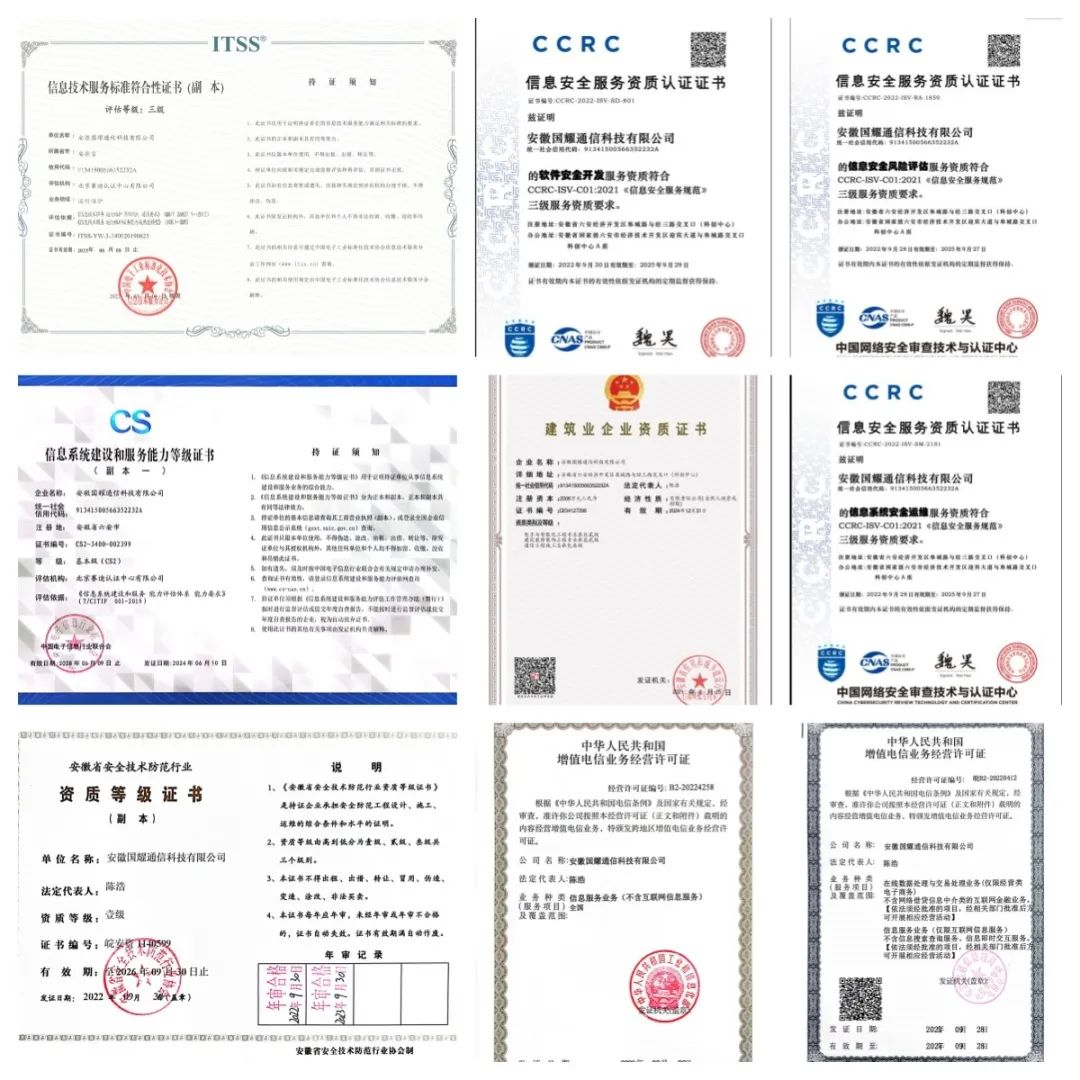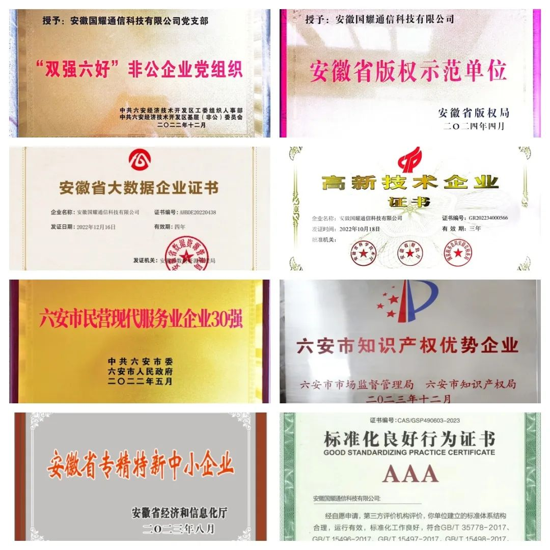 高新技術(shù)企業(yè)、安徽省版權(quán)示范單位證書、安徽省專精特新中小企業(yè)證書、安徽省大數(shù)據(jù)企業(yè)證書、“雙強六好”非公企業(yè)黨組織、六安市知識產(chǎn)權(quán)優(yōu)勢企業(yè)、第四屆六安經(jīng)濟技術(shù)開發(fā)區(qū)文明單位、六安市大數(shù)據(jù)企業(yè)證書、標(biāo)準(zhǔn)化良好行為AAA級證書、市直用人單位勞動保障誠信等級A級等;