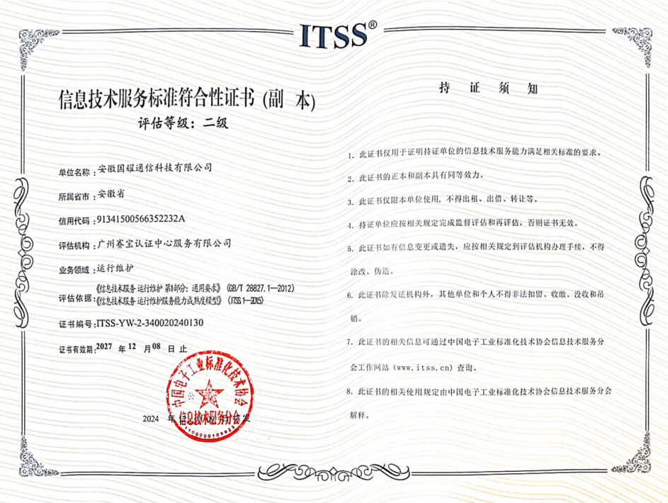 在當今快速發(fā)展的信息技術時代,企業(yè)的運維服務能力成為了衡量其技術實力和服務質(zhì)量的重要指標。近日,安徽國耀通信科技有限公司憑借卓越的技術實力和專業(yè)的服務團隊,在工業(yè)和信息化部組織制定的信息技術服務標準(ITSS)評審中脫穎而出,成功獲得運行維護服務二級資質(zhì)認證。