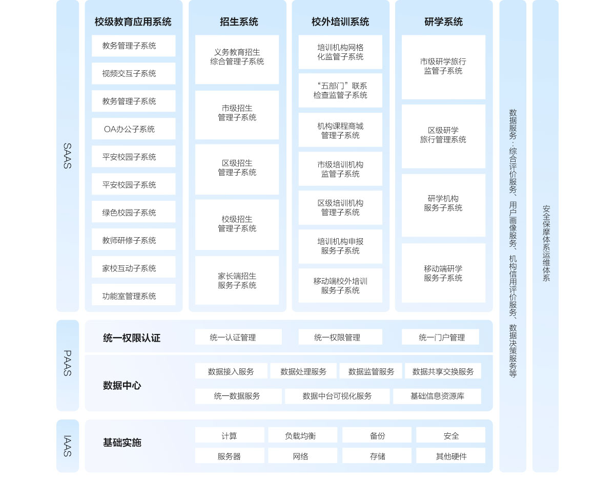 統(tǒng)一身份認(rèn)證、權(quán)管理,構(gòu)建統(tǒng)一的用戶體系、數(shù)據(jù)體系和應(yīng)用體系,面向區(qū)域教育管理者、教師、學(xué)生、家長(zhǎng)、第三方等用戶提供一站式便捷服務(wù)。